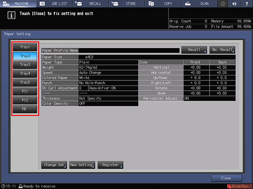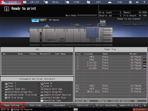 On the touch panel of the main body, press [Paper Setting] on the [MACHINE] screen.