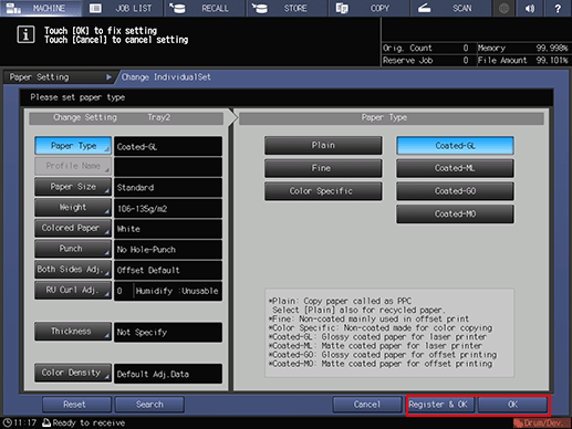 Check the setting details, then click [Register & OK] to register paper conditions.