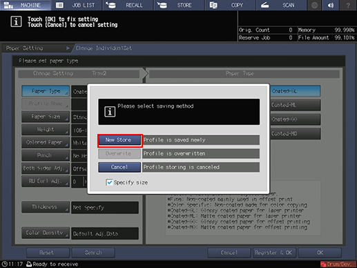 For [Paper Size] in the [Change IndividualSet] screen, only the automatically detected size can be specified. To specify the size directly, use the [Register/Delete Paper Setting] screen (Refer to Paper Profile Setting: Registering the Paper Conditions).
