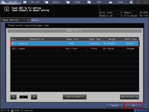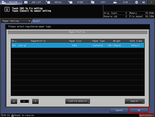 Press [Recall], check that the paper profile has been registered, then press [OK].