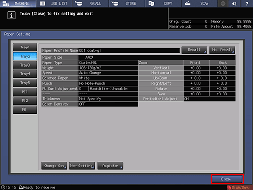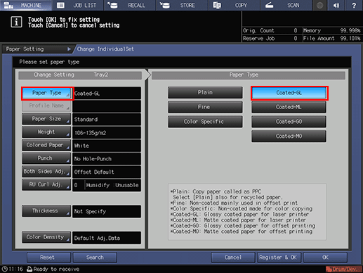 Change the paper setting of the tray on the touch panel of the main body. In this example, ''Coated GL: 106 to 135 g/m2 / 29 to 36 lb Bond'' is set to Tray 2.