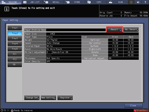 If you know the profile number of the paper condition to be recalled, press [No. Recall]. You can enter the profile number to easily recall the profile and configure settings.