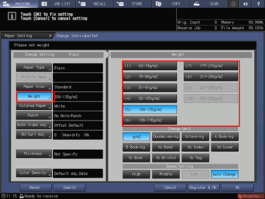 In the [Change IndividualSet] screen, press [Weight]. Press the desired paper weight in the right pane.