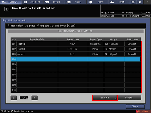 You can edit the setting by selecting the registered paper profile and pressing [Add/Edit]. To delete a registered paper profile, press [Delete].
