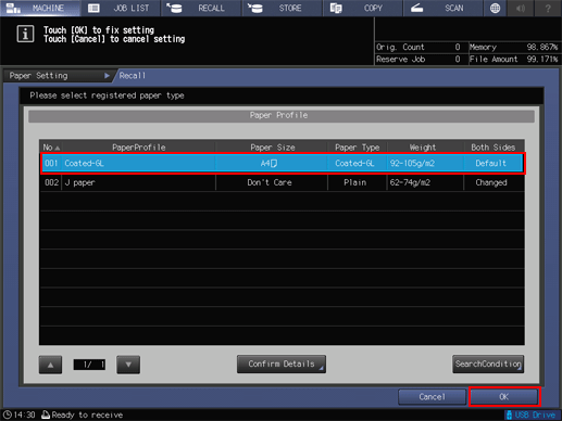 If you know the profile number of the paper condition to be recalled, press [No. Recall]. You can enter the profile number to easily recall the profile and configure settings.