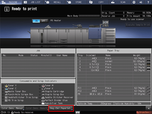 On the touch panel of the main body, press [Paper Setting] on the [MACHINE] screen.