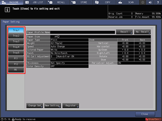 This section describes the procedure to register a paper profile from the [Register/Delete Paper Setting] screen. You can also register a paper profile with a paper size that is not currently used in the tray. You also find how to call and set a profile when necessary.