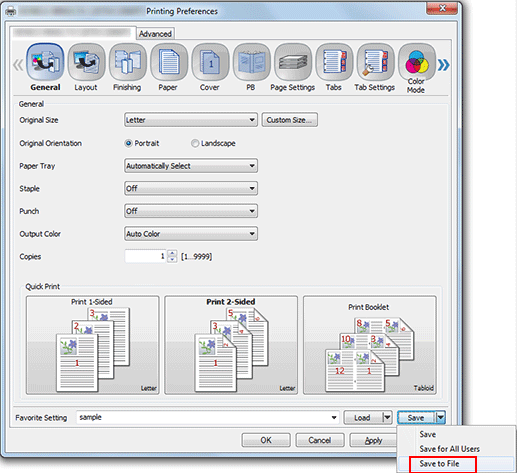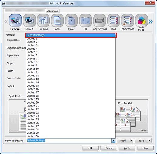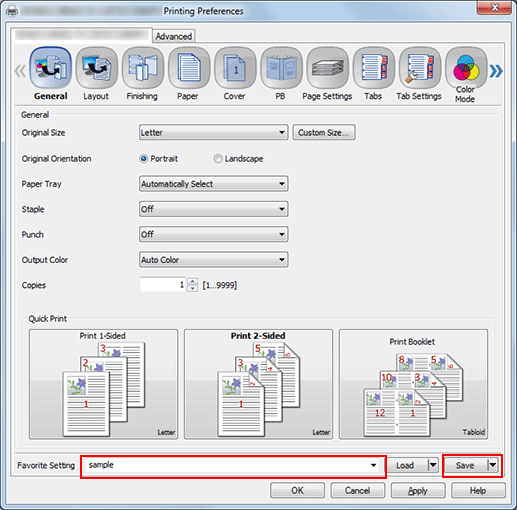 When the print setting is completed, select any user setting number from the [Favorite Setting] pull-down menu.