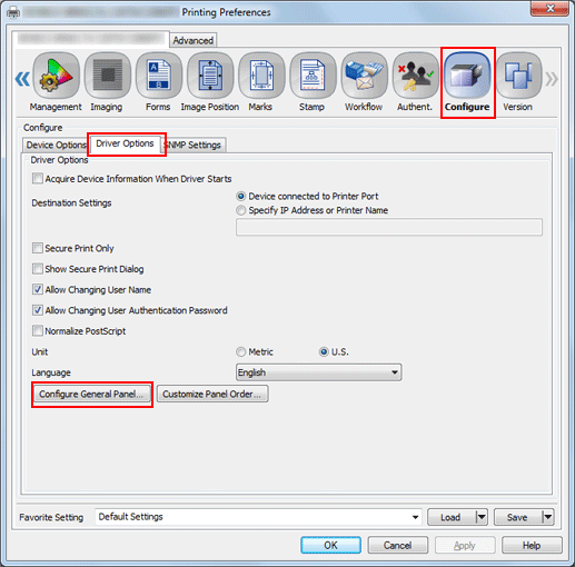 Click the [Configure] tab, then click [Driver Options] - [Configure General Panel].