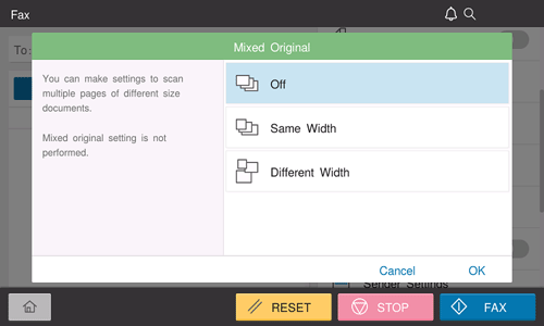 Even for an original with pages of different sizes, by using the ADF, you can scan data while detecting the size of each page. If the widths of the originals are the same, select [Same Width]. If the widths of the originals are different, select [Different Width].