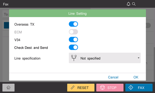 [Line specification] | If multiple lines are used, select the line used to send a fax. In general use, use [Line 1]. If [Not specified] is selected, either line, whichever is not busy, is used for transmission. |