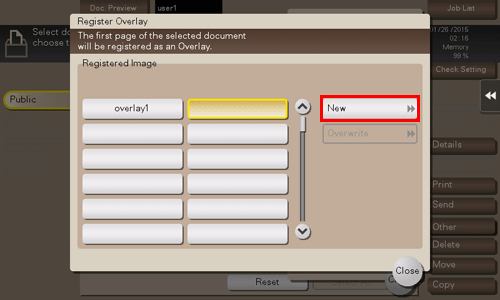 Once registered, you can compose an overlay image on the original and copy it by selecting [Application] - [Registered Overlay] in copy mode of classic style. Also, when you print a file from a User Box, you can compose an overlay image to the file and print it by selecting [Application] - [Registered Overlay].