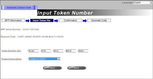 Select [Maintenance] - [License Settings] - [Install License] - [Install License using the Token Code.] in administrator mode of Web Connection (or in [Utility] - [Administrator] of this machine), and enter a token number.