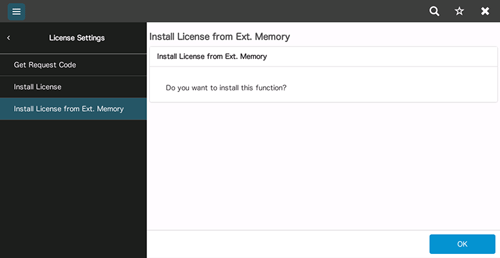 Select [Utility] - [Administrator] - [Maintenance] - [License Settings] - [Install License from Ext. Memory] on the screen of this machine, then tap [OK].