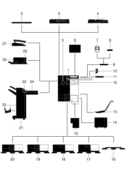 19 | Paper Feed Cabinet PC-216 | Allows you to load up to 500 sheets respectively in the top and bottom trays. This unit is referred to as Double Paper Feed Cabinet in the manual. |