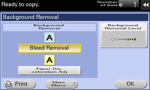 [Bkgd. Removal Level] | Adjusts the density of the background color for an original with a colored background. If [Auto] is selected, the density of the background color is determined automatically, and the original is copied at the optimal background density level. |