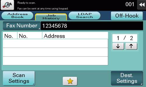 Tapping [Job History] displays a list of transmission logs. Specify the target destination from the previous five job histories.