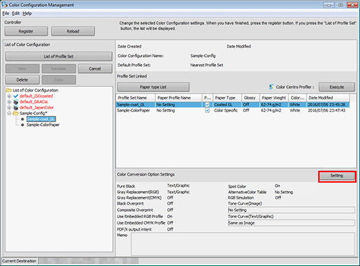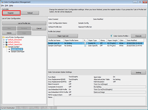 Then, register color configuration, which consolidates several profile sets (used for all paper types for a specific job output) and other color settings information.