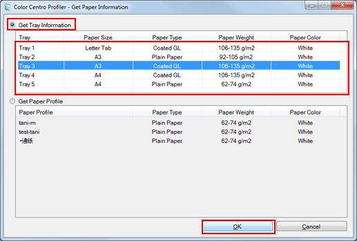 Example: In this example, click Get Tray/Paper Profile Information so as to use the paper setting for Tray 3 (Coated GL: (A3) 128 g/m2 / 33 lb Bond).