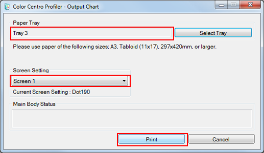 On the Output Chart screen, set the Paper Tray and Screen Setting. After setting, click Print.