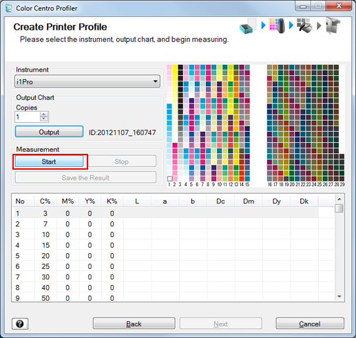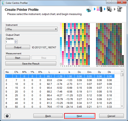 When the chart measurement is completed, the measurement result is displayed at the bottom of the Create Printer Profile screen.
