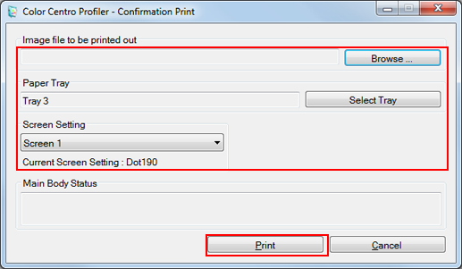 On the Confirmation Print screen, specify the image file to be printed, paper tray, and screen to be used. After setting, click Print.