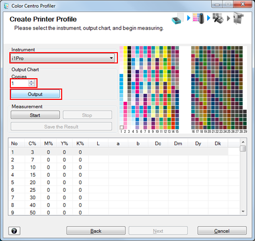 When the chart measurement is completed, the measurement result is displayed at the bottom of the Create Printer Profile screen.