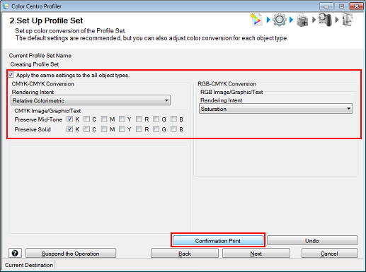 Set the color conversion (rendering) for each object. After setting, click Confirmation Print to check the result.