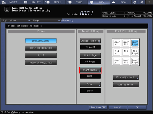 Press Start Number on the Numbering screen to display the Start Number Setting screen.