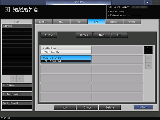 Enter information of a destination on the Add SMB Address screen. Pressing each item displays each screen to enter characters.
