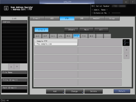 Enter information of a destination on the Add FTP Address screen. Pressing each item displays each screen to enter characters.