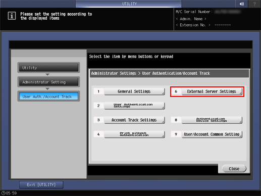 Press User Auth./Account Track on the Administrator Setting Menu screen, and then press External Server Settings.