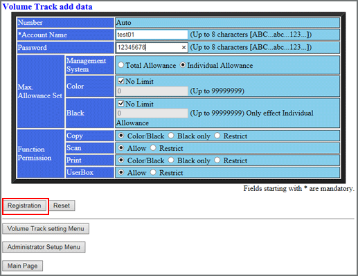 - If the account track authentication system of the machine has been set to Account Name & Password, always register an account. If a duplicate account name exists, an error message is displayed to show unavailability.