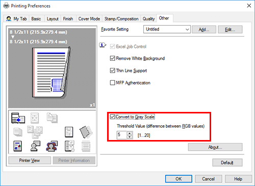In the [Other] tab, check the [Convert to Gray Scale] box and set the threshold (the differential RGB values to be converted into gray scale).