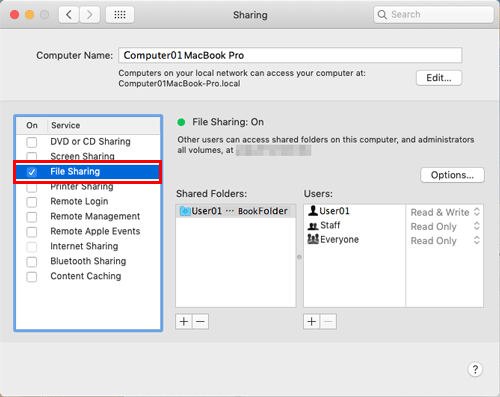 First, create a shared folder that is only to be used to receive scanned original data. Then, check the IP address and user name, and start sharing.