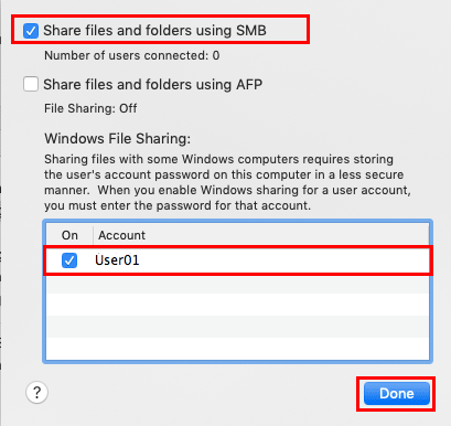 8. Click [Options], and select the [Share files and folders using SMB]. Then, select the log-in user name (displayed name) check box.