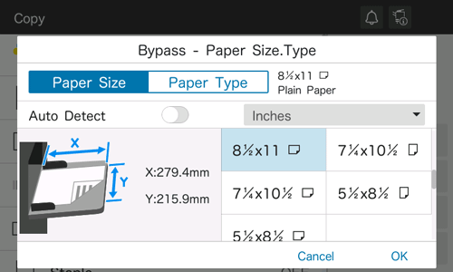 [Auto Detect]: Automatically detects the size of the loaded paper (only for the optional Paper Feed Unit).