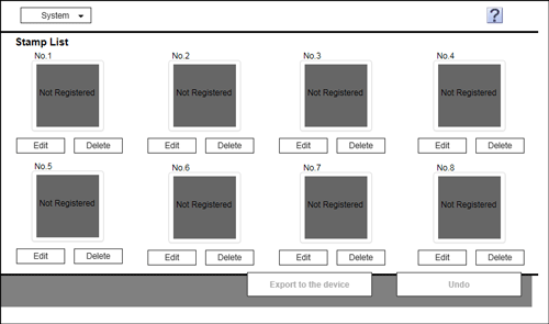 • Clicking [Delete] deletes the registered stamp data. The stamp data will not be deleted until you click [Export to the device] and write it to this machine.