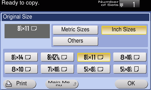 [Inch Sizes] | Select this option to scan an inch-size original. Tap [Inch Sizes], and also select a standard inch size. |
