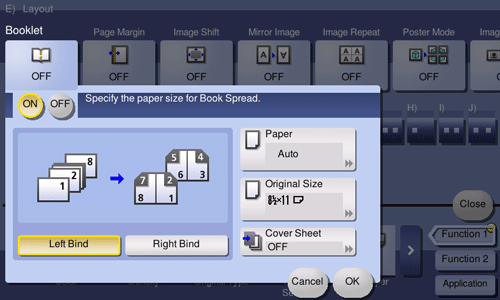[ON]/[OFF] | Select [ON] to specify Booklet. |