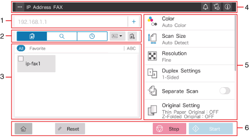 If you tap [IP Address Fax] on the home screen, the main screen of IP Address Fax is displayed.