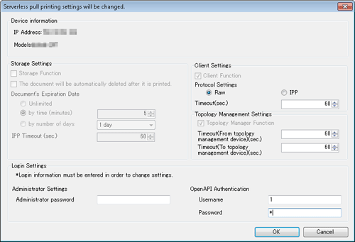 Change serverless pull printing settings, enter the MFP administrator password and the OpenAPI user name and password in [Login Settings], then click [OK].