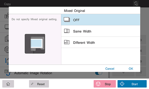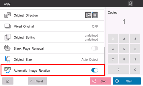 In [Automatic Image Rotation], select the item in accordance with the current orientation of the paper and original, then tap [OK].