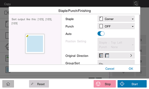[Position Setting] | Select a desired staple or hole-punch position. Setting to [Auto] automatically determines the stapling and punching positions based on the direction of the loaded original. |