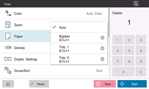 [Paper] | Select the paper tray where paper for copying is loaded. |
