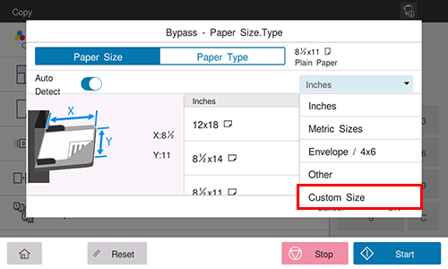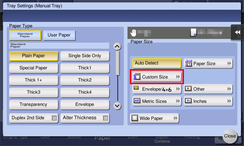 On the paper screen of copy mode, specify the tray containing custom size paper; this will enable you to print on custom size paper.