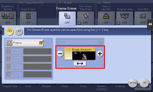 To specify the width of the frame to be erased individually, set [Frame] to OFF, select a target side, then specify the width to be erased.