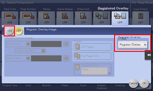A. Yes. You can register the logos and favorite images in the storage of this machine to add such overlay images to copy outputs.