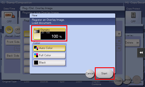 Load the original containing the overlay image to be registered, change image settings as necessary, then tap [Start].