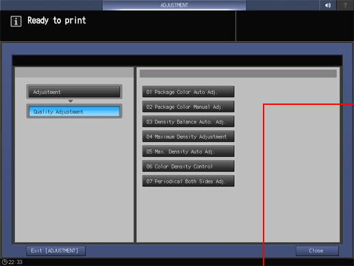 When Integrated Color Care Unit IQ-501 is mounted on the machine, the automatic adjustment is performed. However, to print test charts, select the appropriate screen.